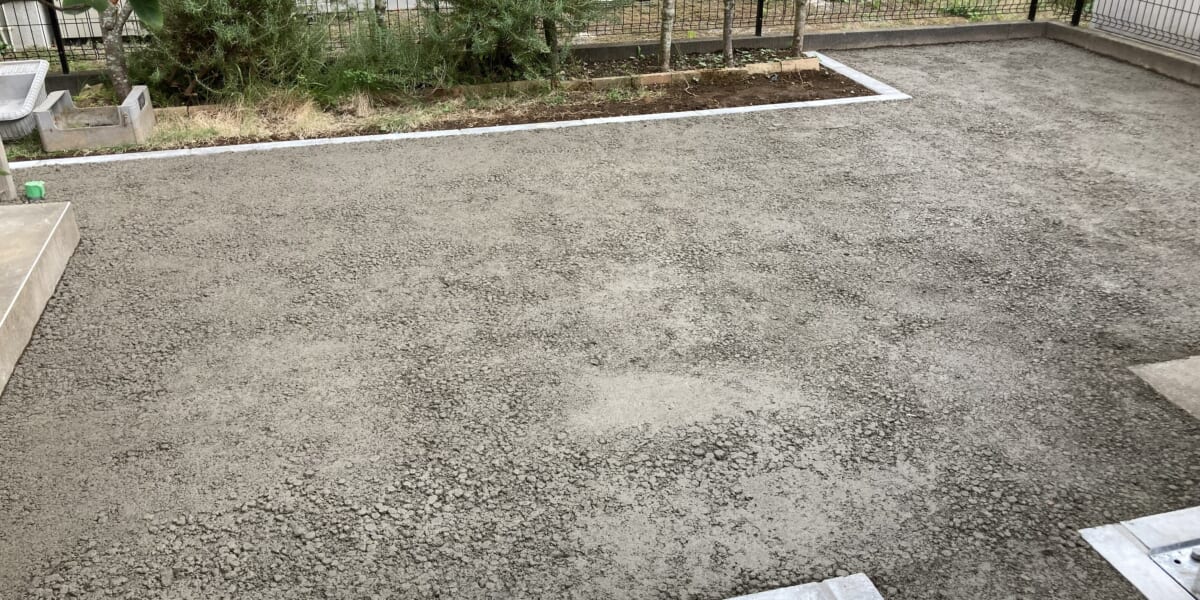 工事後にご自身でウッドデッキを施工されるとのことでした。ウッドデッキの下に雑草が生えるのが嫌なのでコンクリートで固めてしまおうと思いましたが、地面は平の方が良いとのことで勾配が取れず、水たまりになってしまう恐れがありましたので、透水性のコンクリートを使用して地盤を施工しました。