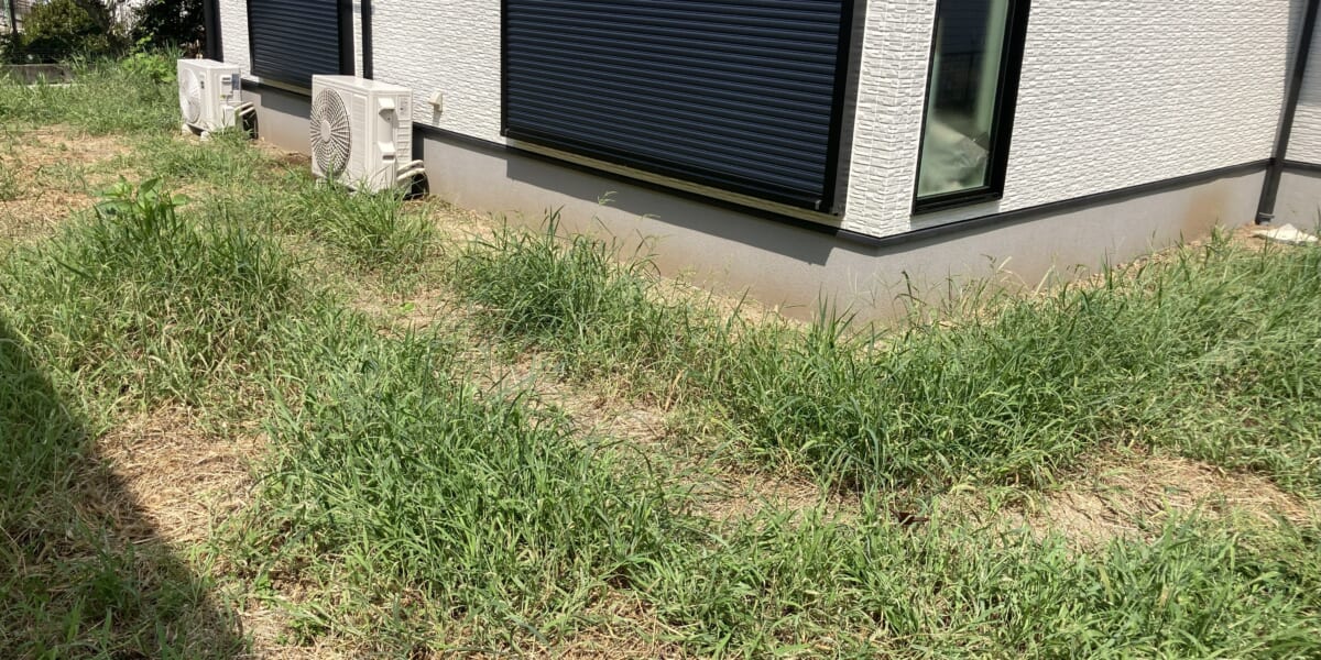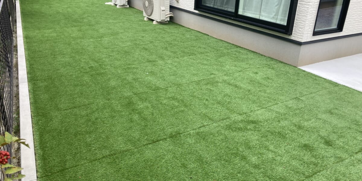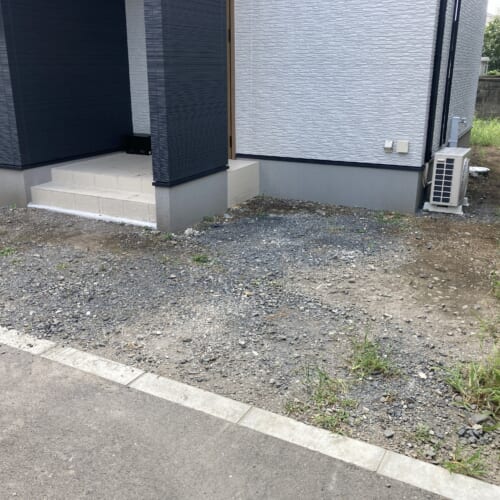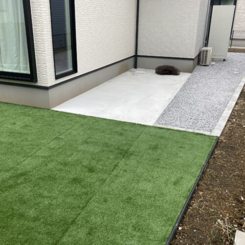 ほおっておくと大変なことになる雑草対策です。お庭のほとんどを人工芝にしました。後に花壇・菜園が出来るように日当たりの良い場所にスペースを設けてあります。