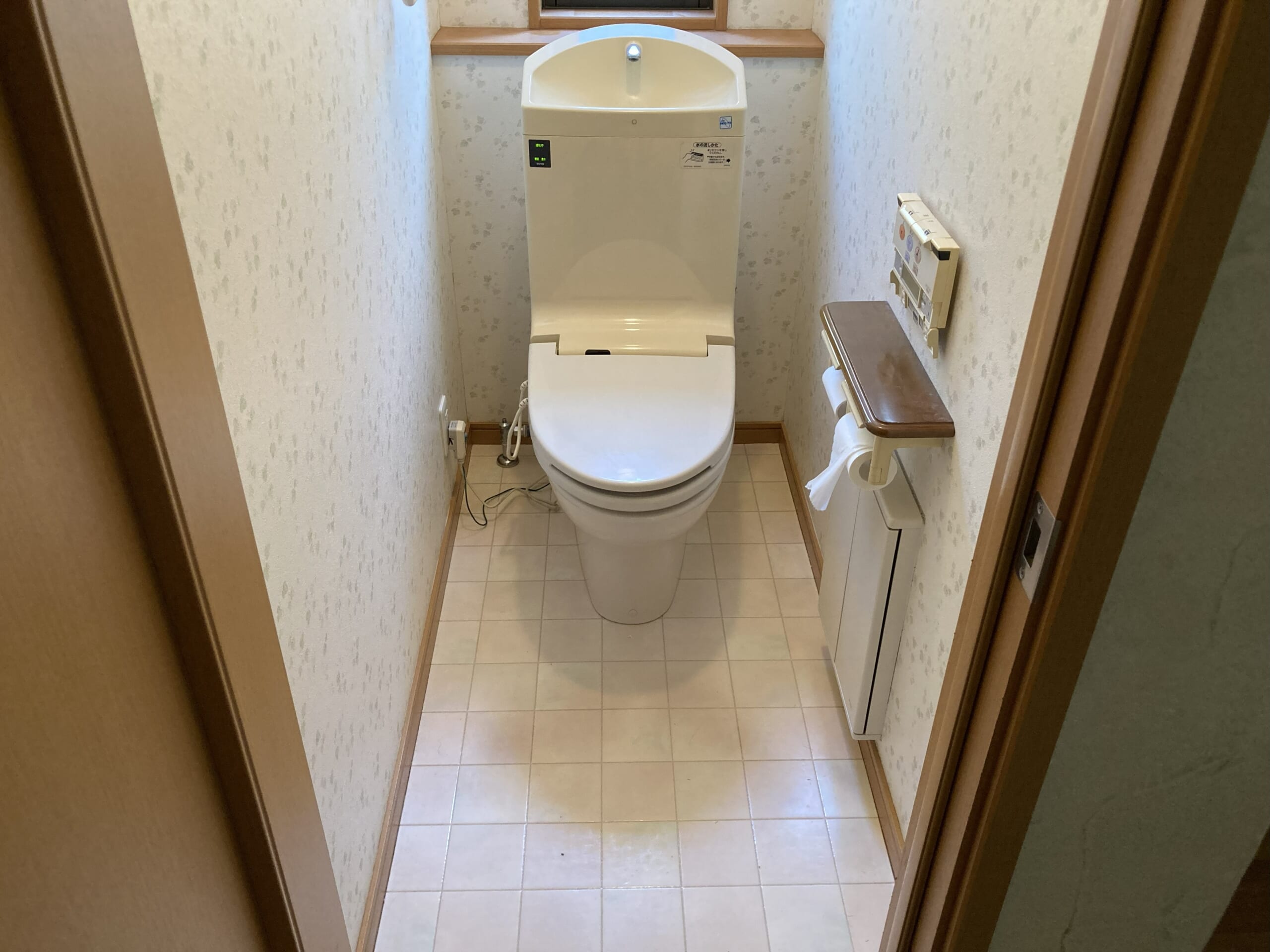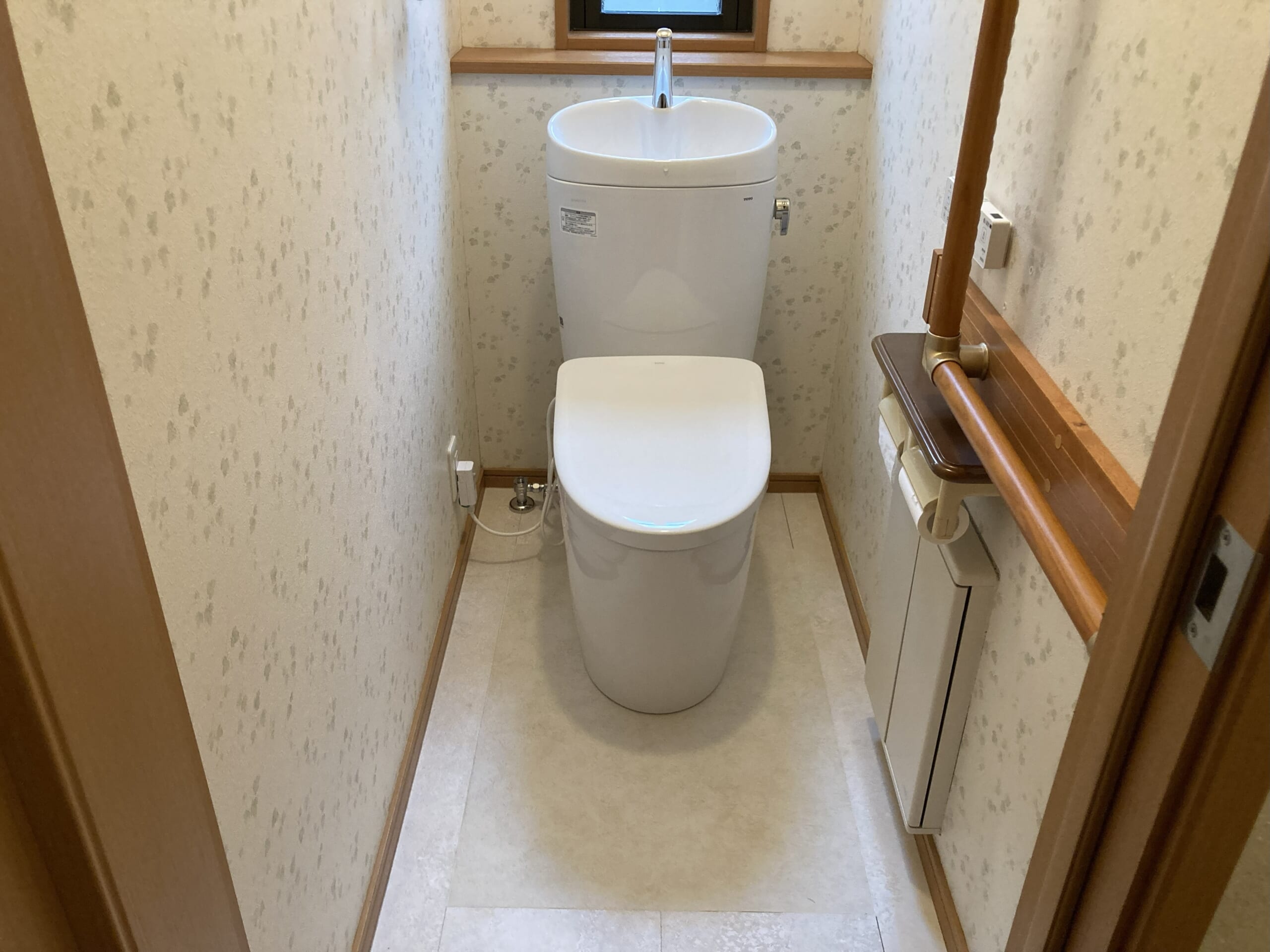 既存のトイレの水漏れがありましたが全自動がご要望でしたので交換致しました。床は濡れても大丈夫でお掃除が楽なセラミック製です。片腕がご不自由とのことで手すりを設置致しました。