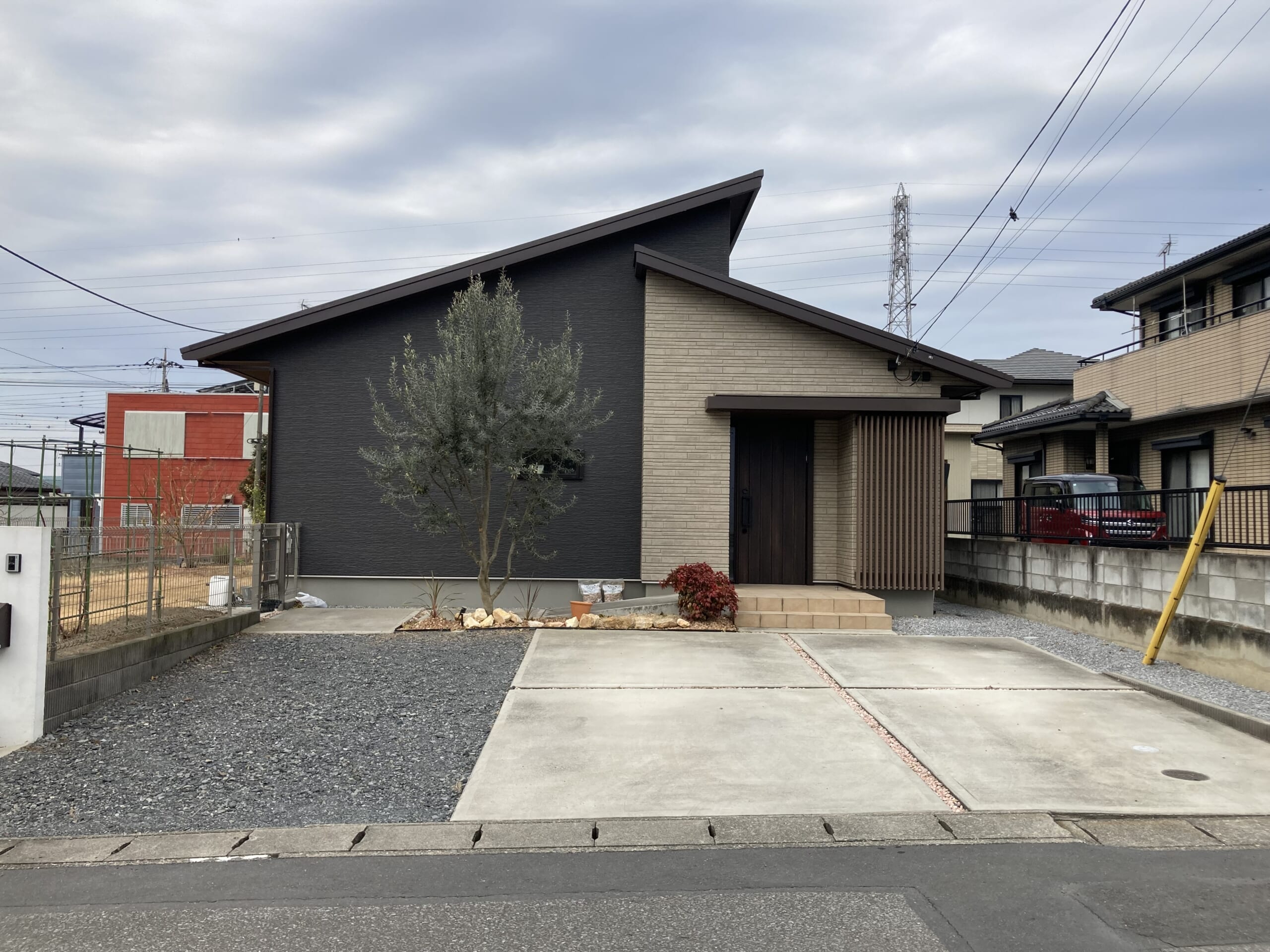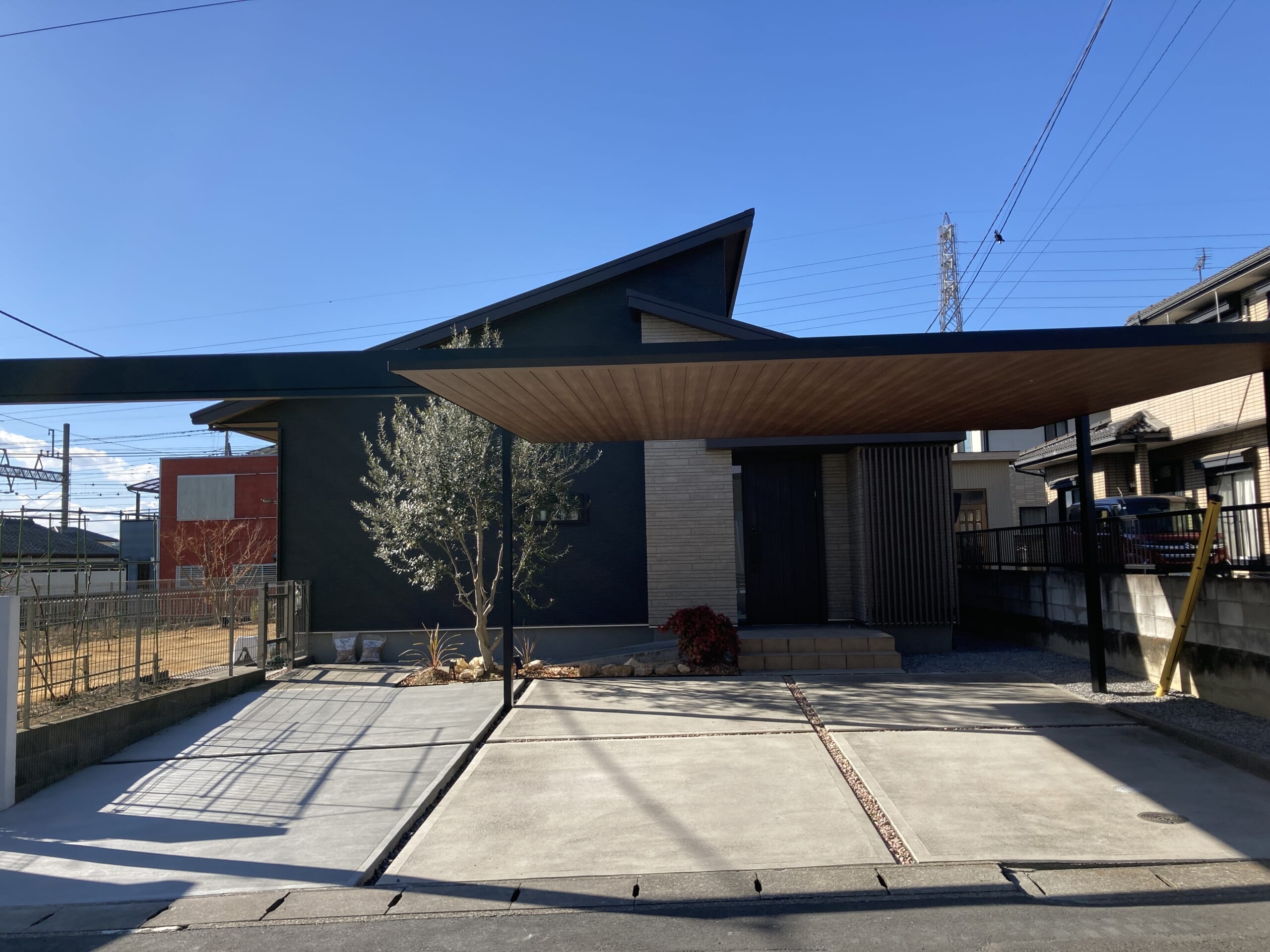 お客様の要望で屋根は木調を選定しています。ブラックのフレームに迫力あるカーポートに仕上がっていますね