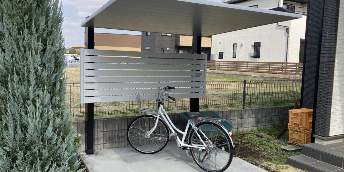 かっこいいものをご希望でしたのでフラットアルミ屋根の【LIXIL】SCミニをお選びいただきました。シンプルスタイリッシュな佇まいは一味違います。設置個所も使い勝手が良い様に玄関に近い部分にしています。地面も土間コンクリートにして自転車を止めやすくなっています。