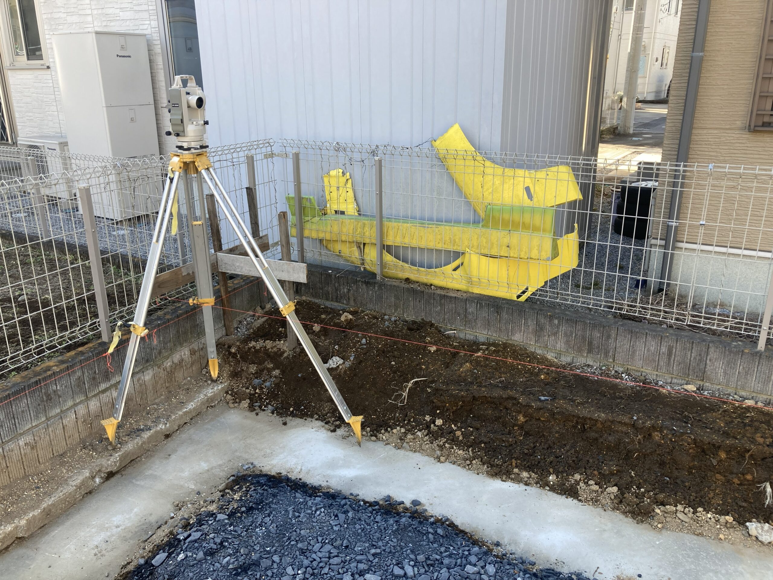 ガレージの基礎を作るためにあらかじめ打設したコンクリート(均しコンクリート)に位置を出していきます。