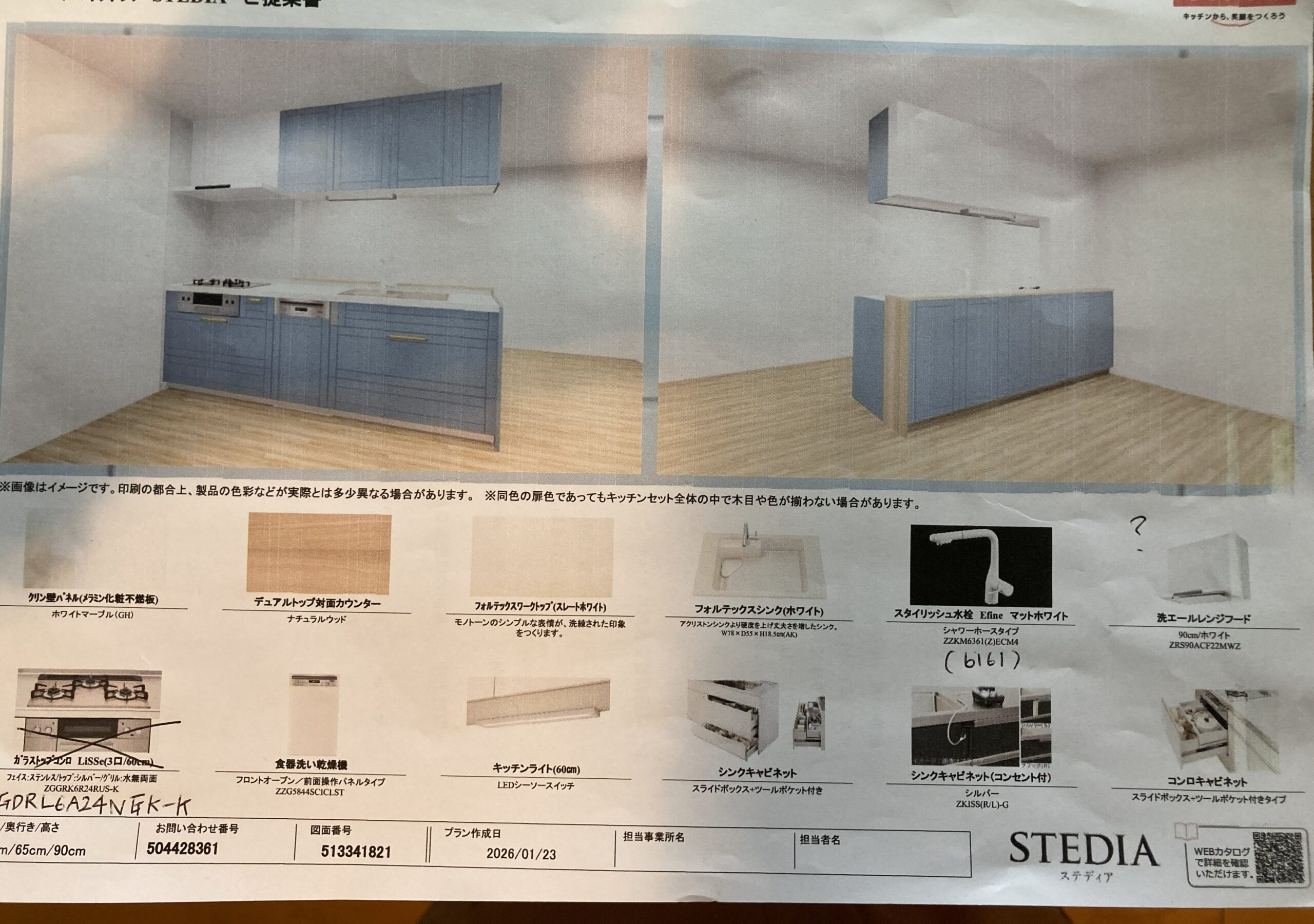 お知り合いからの紹介でキッチンリフォームのお問い合わせをいただきました。先日のお休みにショール―ムを何件か廻りお気に入りのキッチンを見つけてきたそうです。これを基に見積致します。
