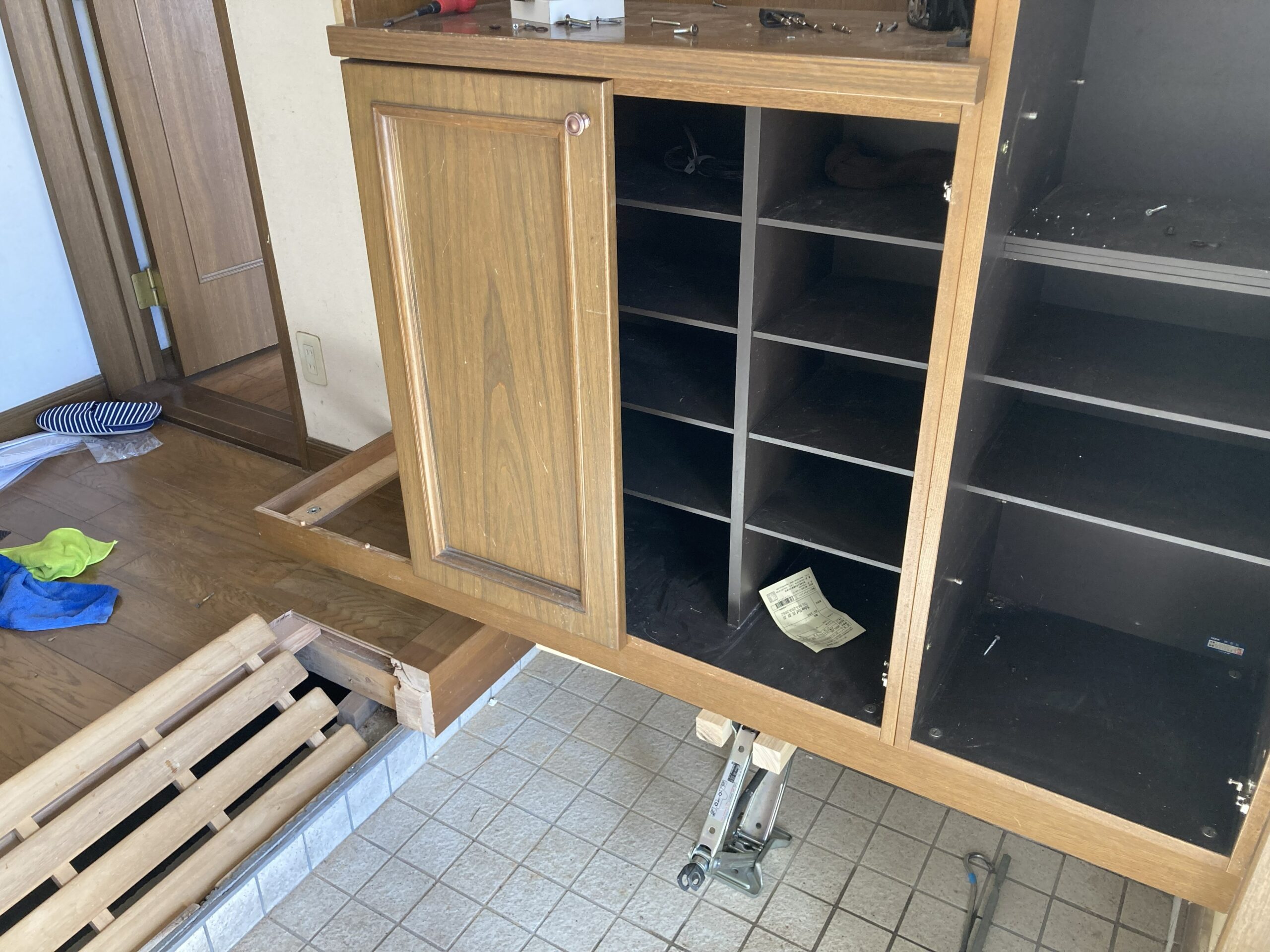床がブカブカするのでフローリングを剝がしたところ框がシロアリに喰われていました。框の交換の際に下駄箱の取り外しも行っています。