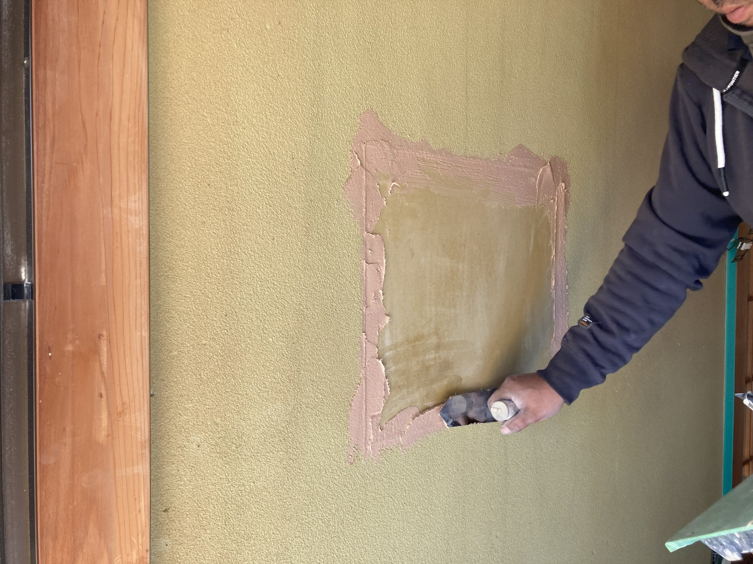 物をぶつけて穴の開いた壁を補修します。ボード材を貼ってパテで平らにして聚楽壁を塗っていきます。