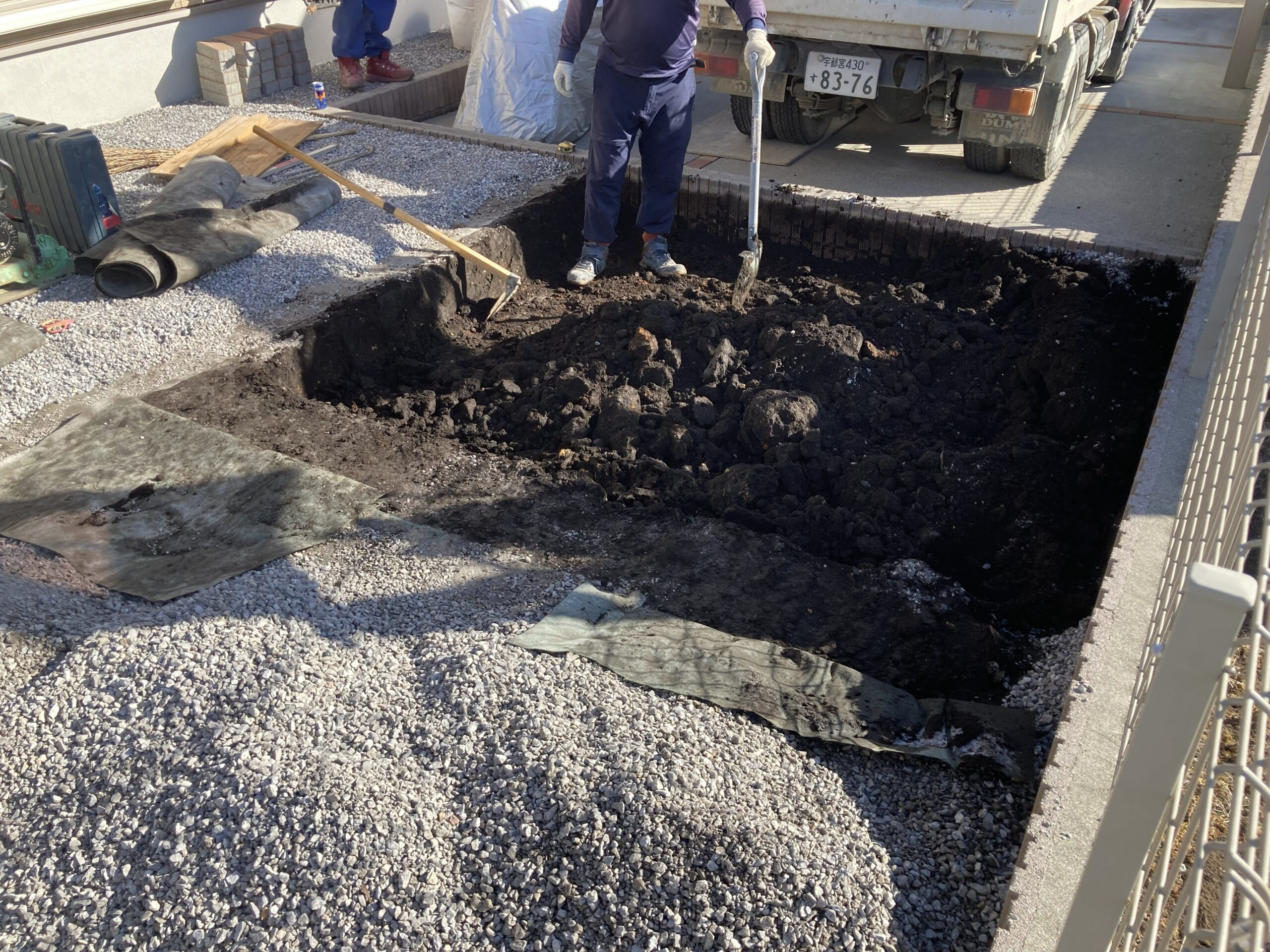 駐車場の増設工事ですが機械が入れない為、手作業にて掘削していきます。気温は寒いですが、汗かきながらの作業です。
