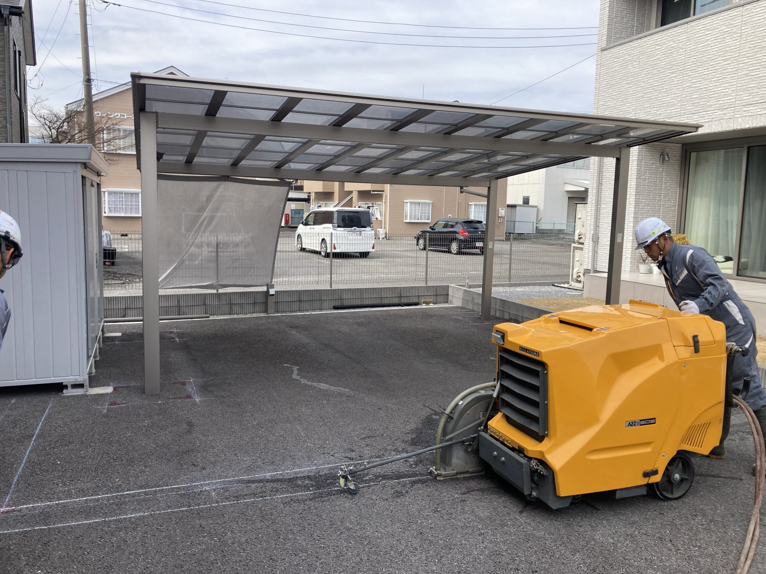 ガレージを設置する為に基礎部分のアスファルトを撤去します。基礎の位置を出してまずはアスファルトを切断していきます。