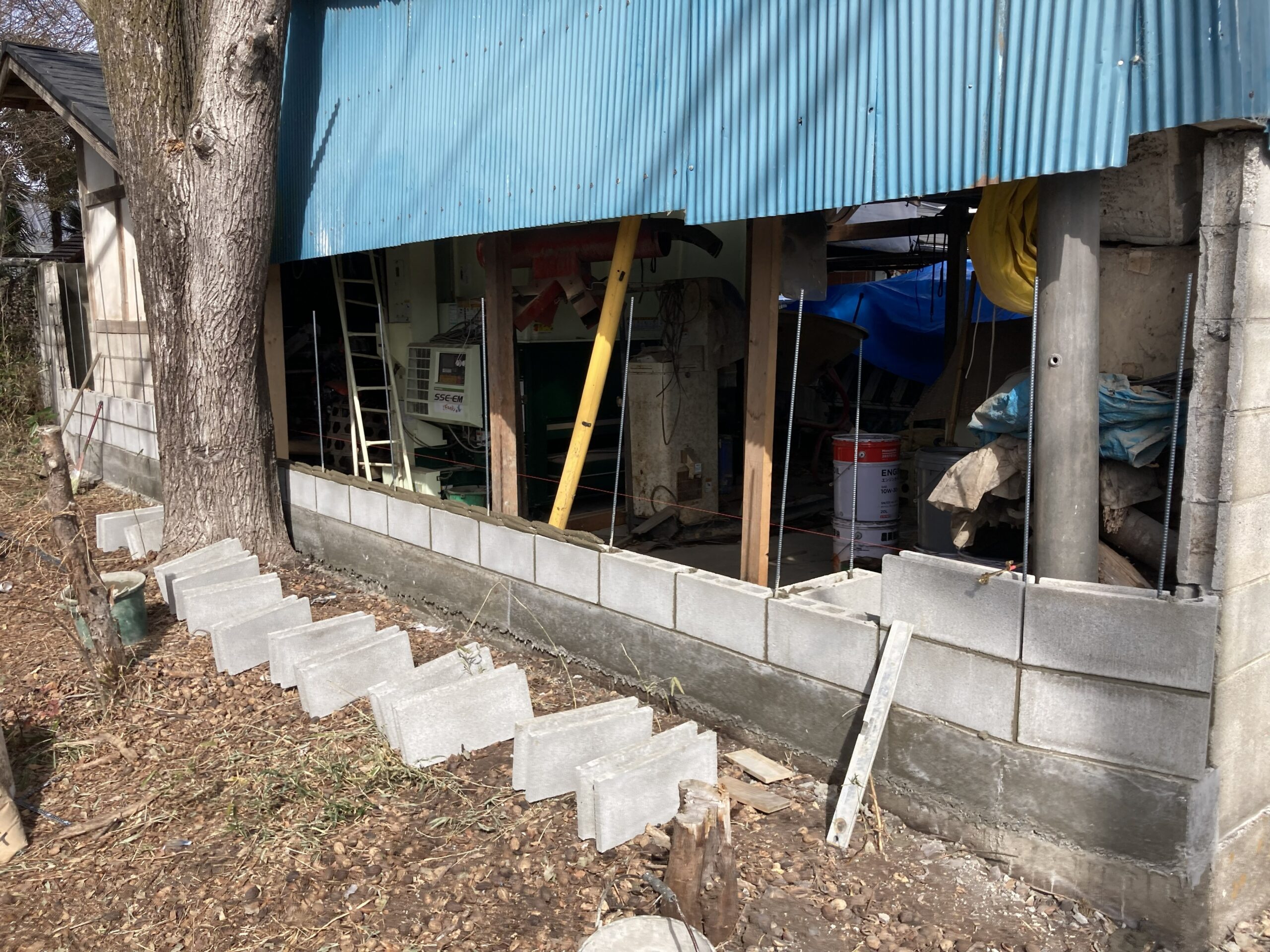 傾いていたブロック塀を撤去して垂直に積直しです。