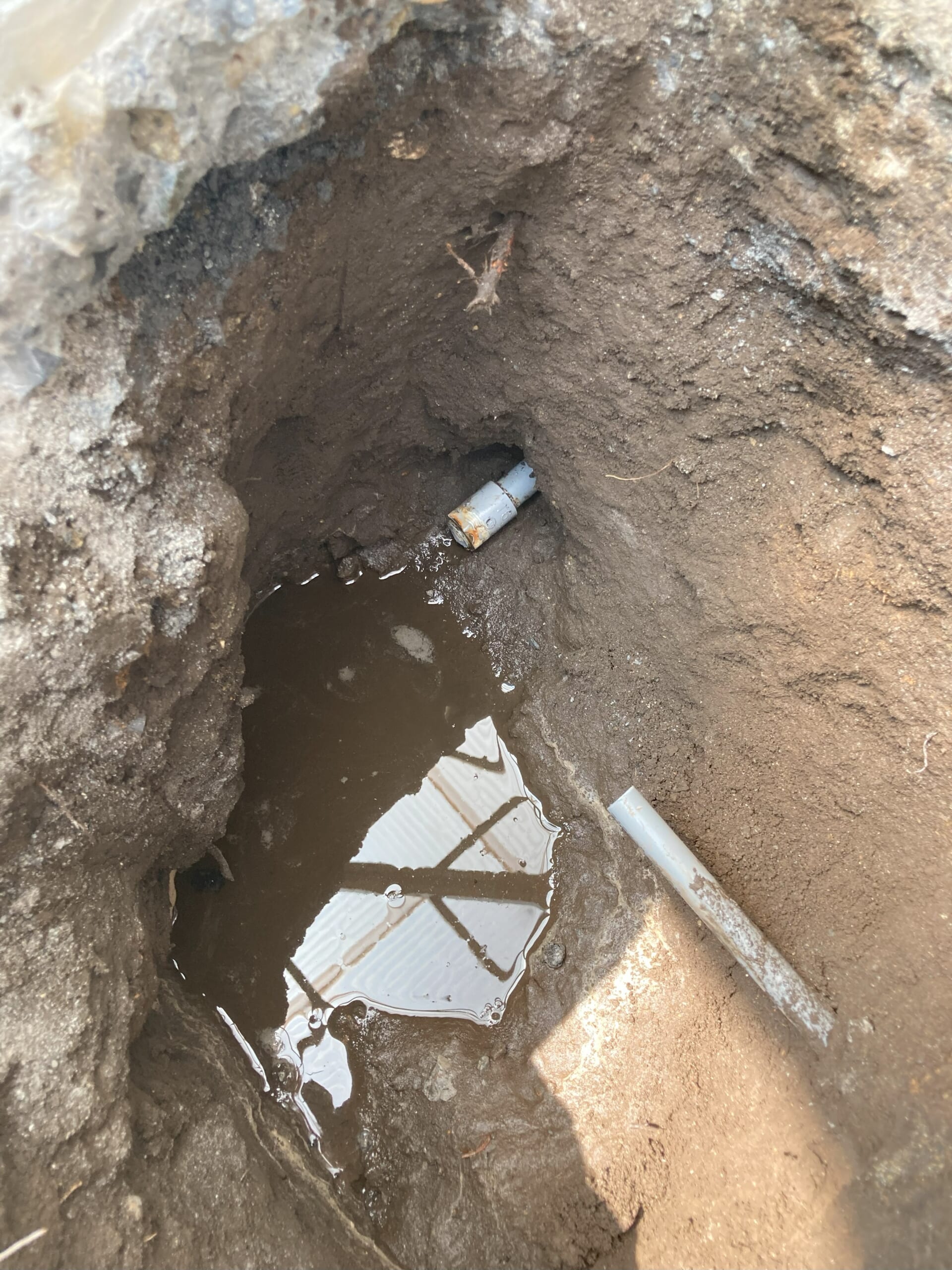 外に設置してある水道の土間付近から水がしみ出てくるとご連絡を受け調査しました。 土間を壊して掘り返してみると古い配管なので折れていました。早々に修理です。