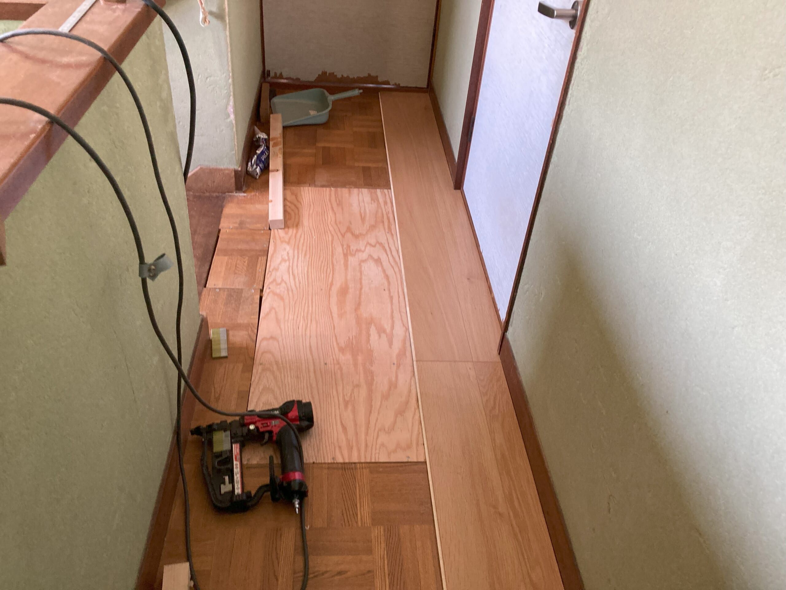 部分的にブカブカしてしまったので補修致します。傷んだところの床をはがして新規に貼替します。そして既存の床の上に新規にフローリングを貼っていきます。