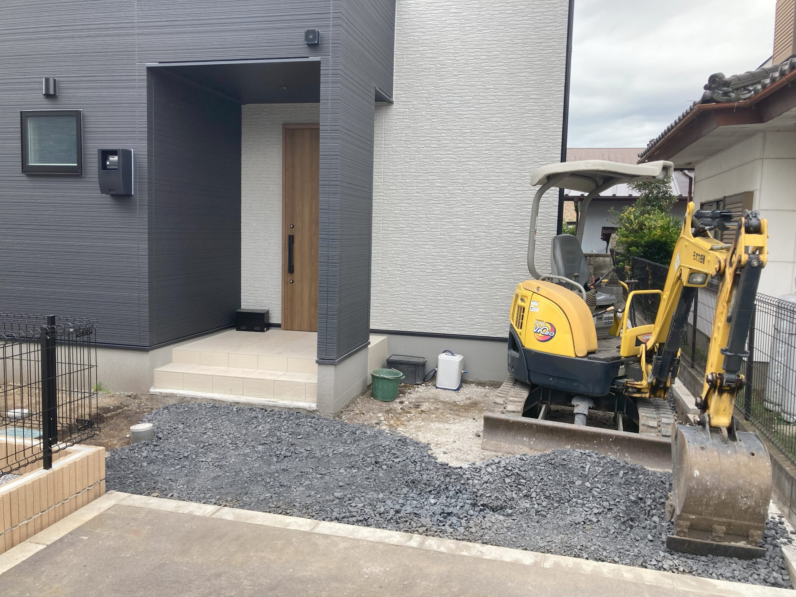 新築の外構工事となります。トラブルにならないように工事着工前には建物廻りの傷や汚れがないか確認しておきます。