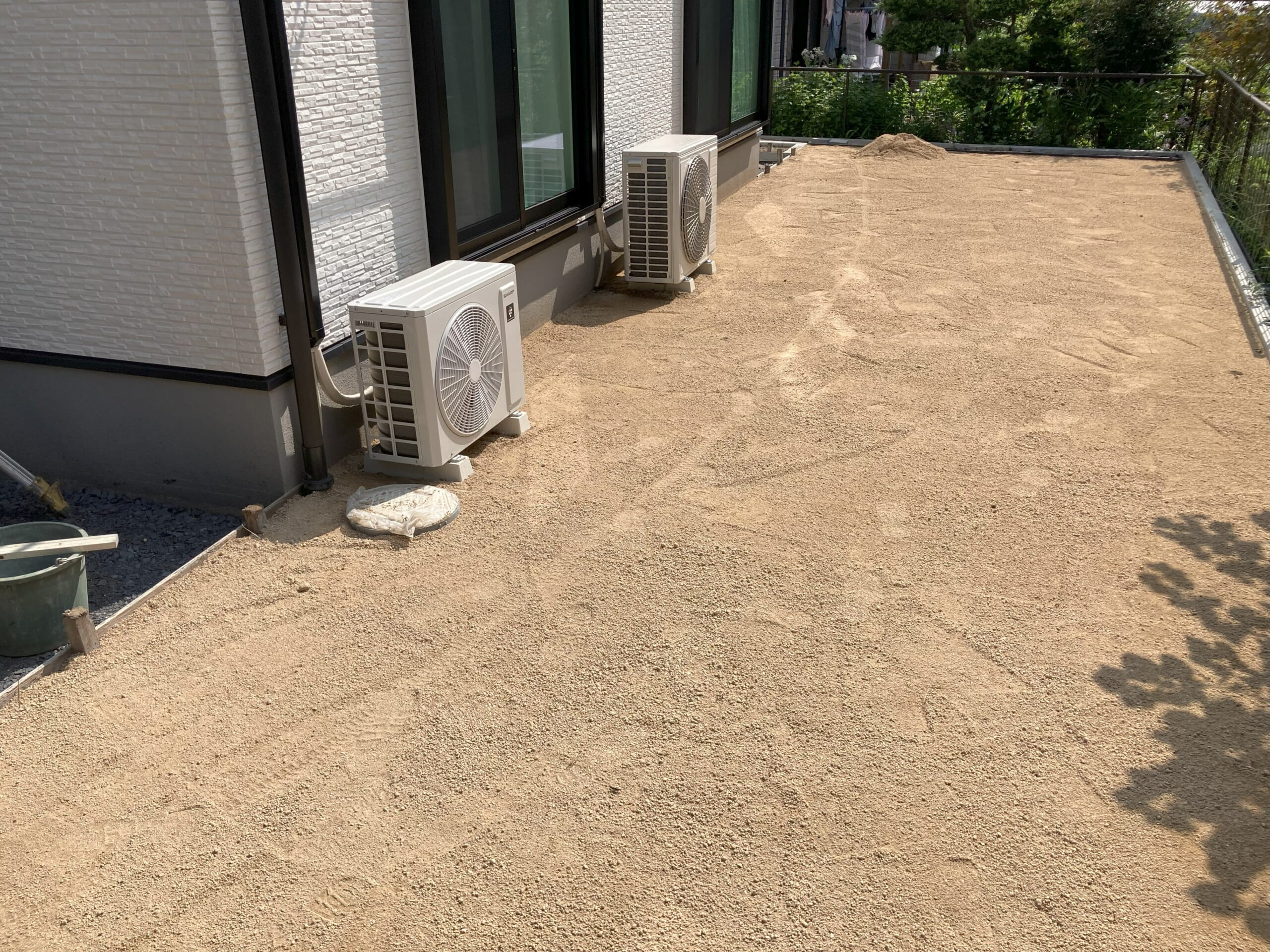 山砂を平らに敷きならします。ここで人工芝の平坦度が決まります。人工芝を敷いてからはやり直しが大変です。凹凸や突起物がないか確認します。