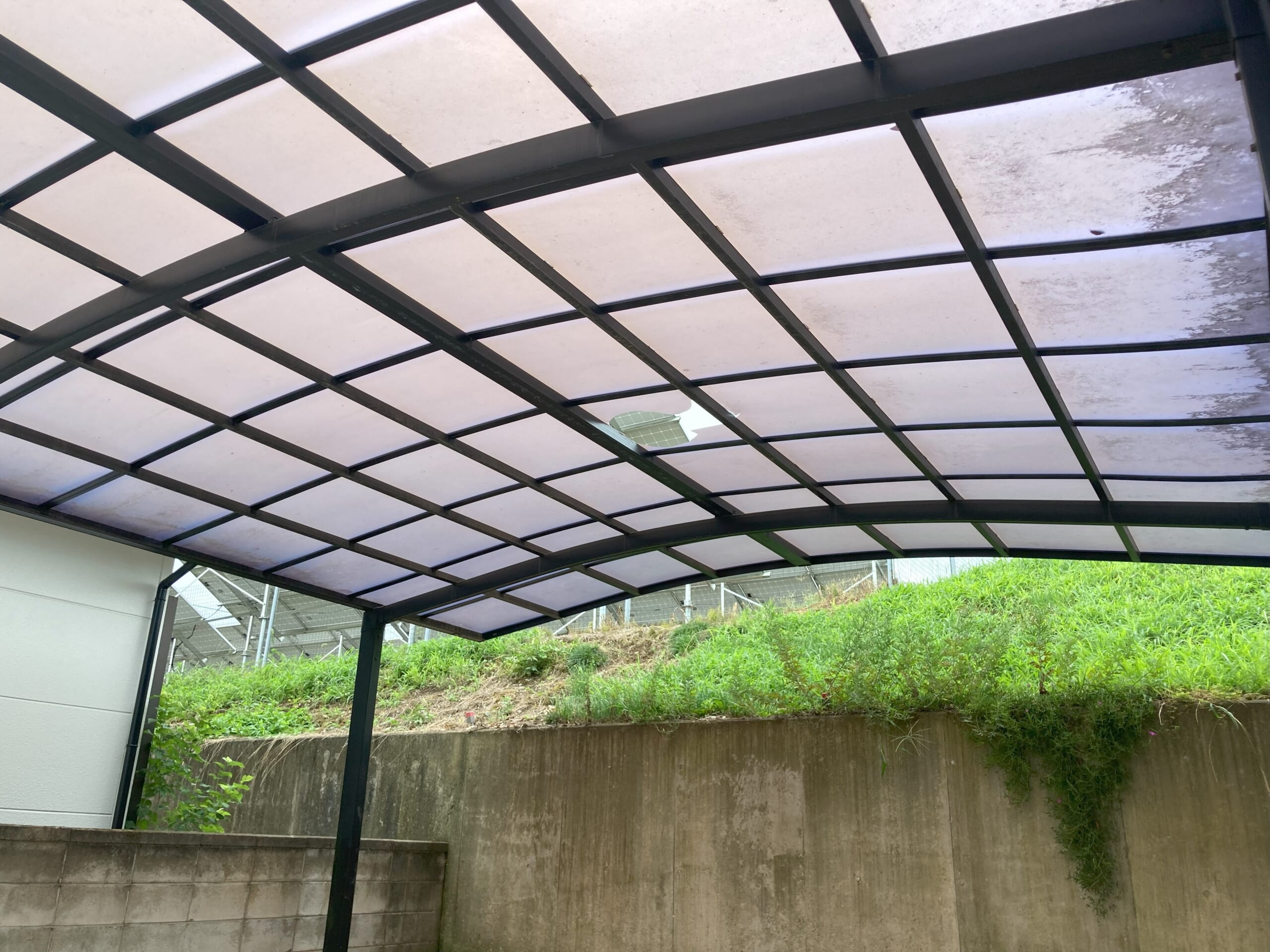 カーポートの屋根に穴が空いてしまいました。昔の屋根はアクリル板でしたが今はポリカーボネート板になっていてアクリル板の50倍の強度があります。一部だけ交換しても色が変わってしまうのとまたほかの部分も穴が空くかもしれないので全面交換のお見積となりました。