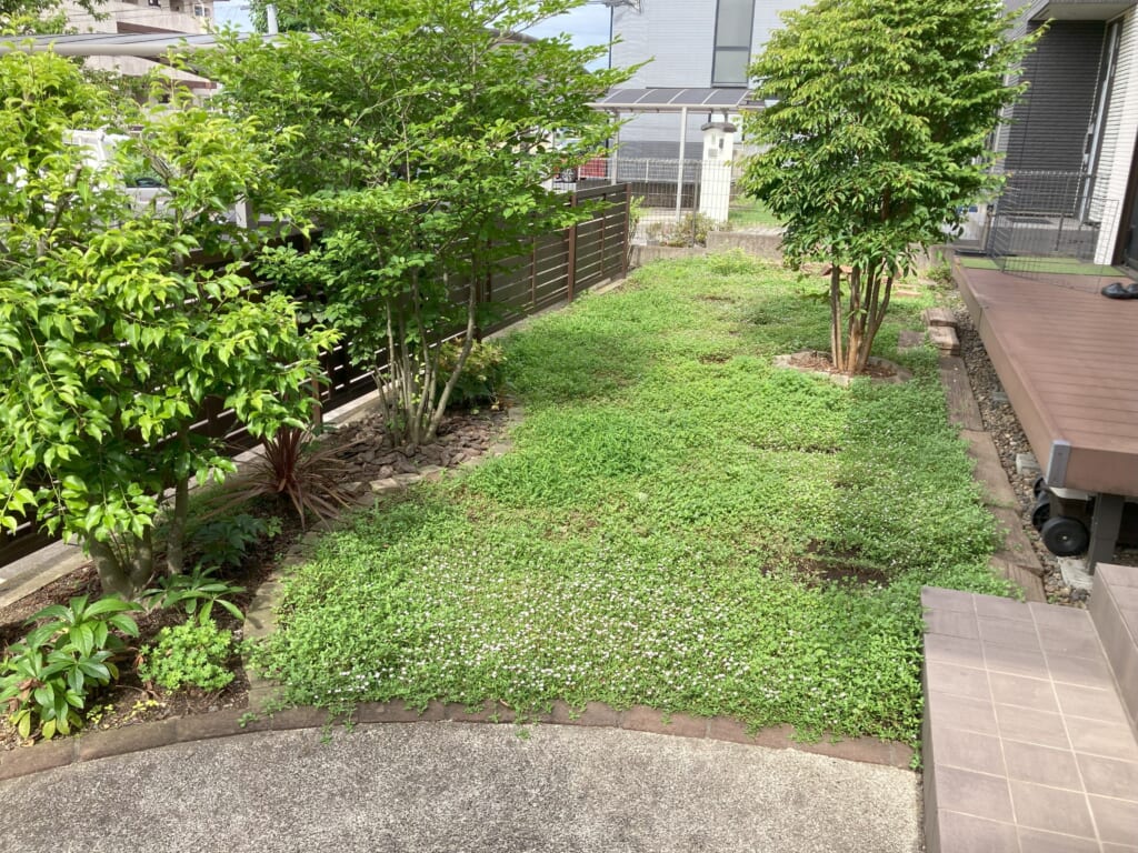 お庭のグランドカバーを撤去してお手入れのいらない人工芝を施工します。