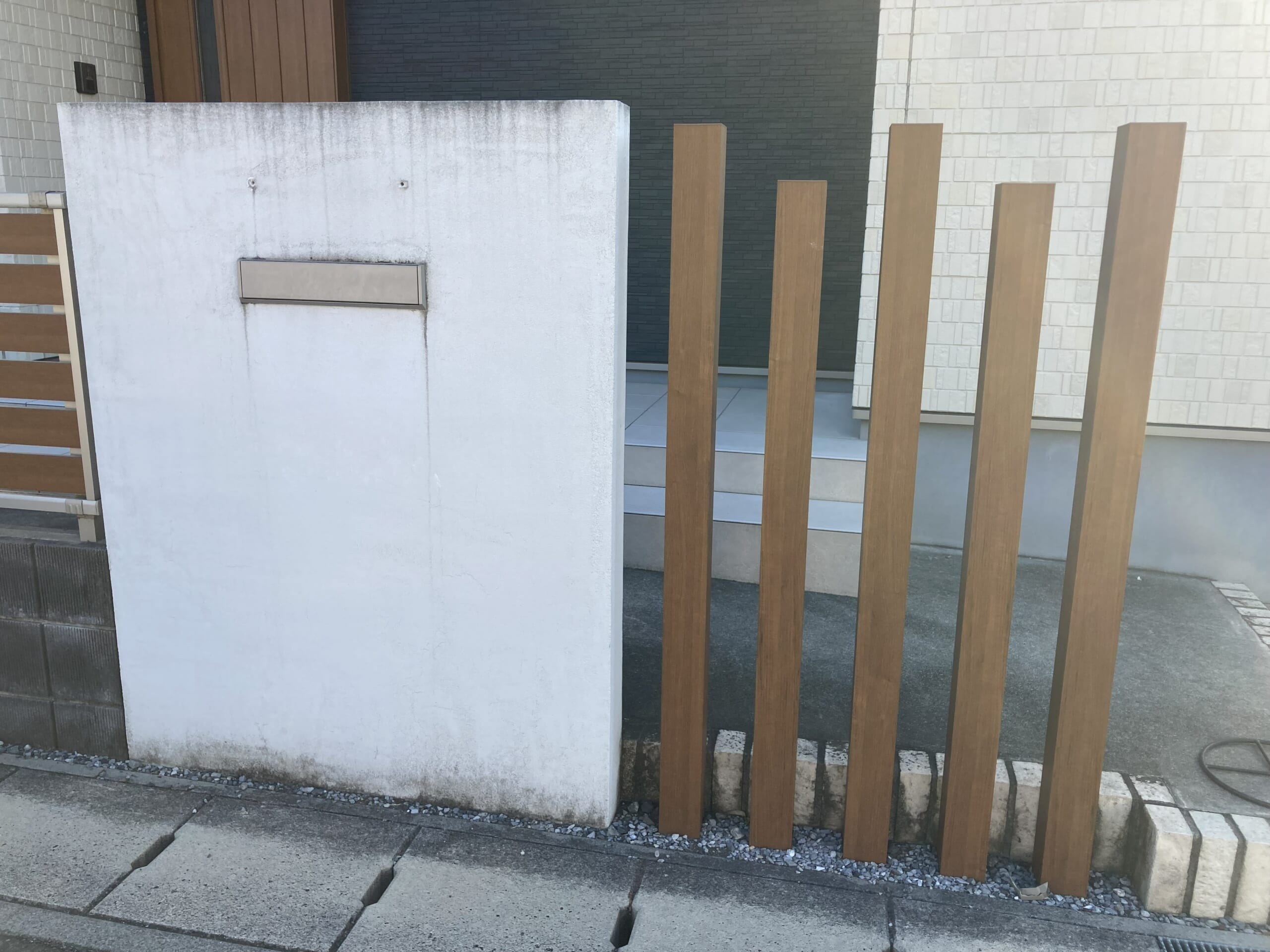 掃除しても汚れがすぐついてしまう為イメージを変えて紺色に塗装します。表札も新しいものに交換です。